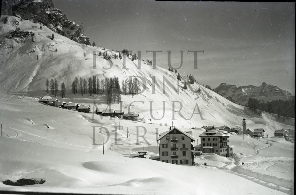Descriziun: Le retrat mostra na pert dl paisc de Calfosch d'invern fora; da odëi él l'alberch Sport y la ponsiun Sella, la dlijia y les vijinanzes Alton, Iosc y Ruac.