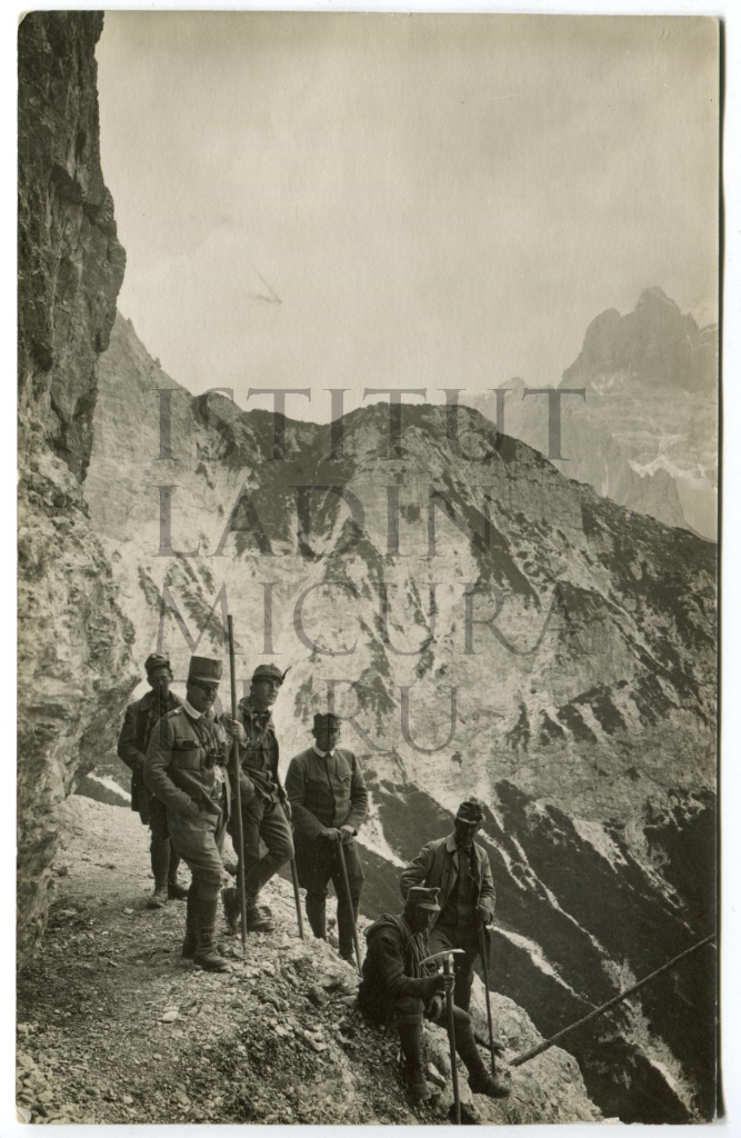 Descriziun: N grup de soldat austriacs che va fora por en banch por traversé da le Forame cuntra la Costa Bela, tl grup dl Cristallo.