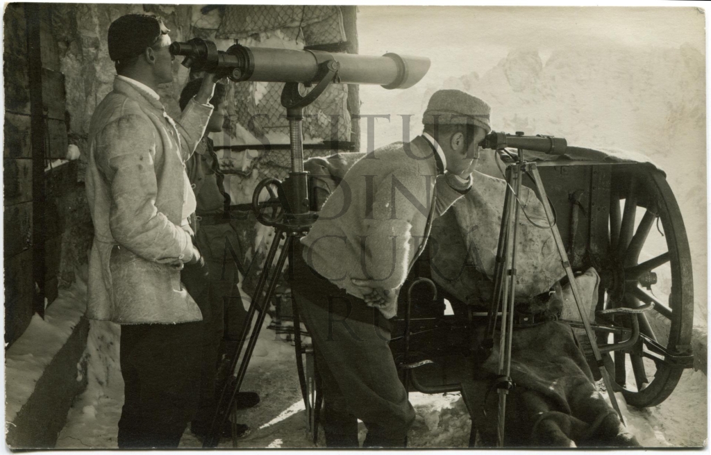Descriziun: Dui soldas austriacs tl laur da ciaré cuntra les lines nemiches cun le ro da ciaré dalunc, pro la postaziun di canuns sön la Cima dei Rondoi-Schwalbenkofel.