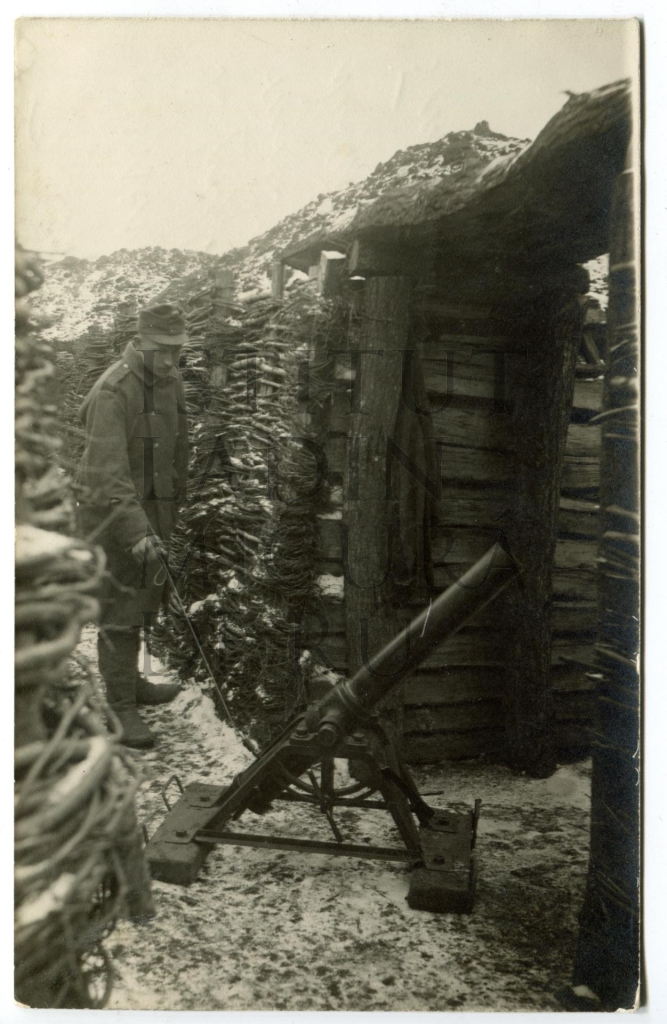 Descriziun: Retrat de n soldá tl fossé da combatimënt, che é tl laur da arjigné ca n canun -bonamënter n "Minenwerfer" - por le colp.
