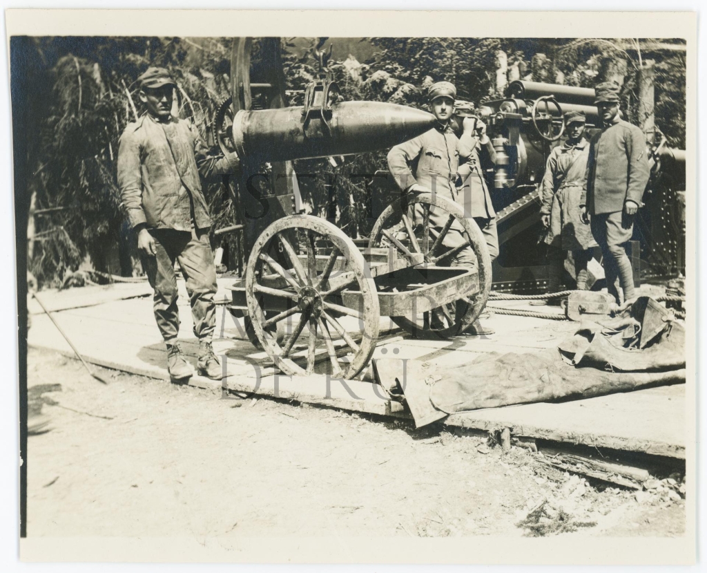 Descriziun: Soldas stá sö por la fotografia dlungia na patrona caliber 305 por obiza (na sort de canun). Doía vëigon le canun.