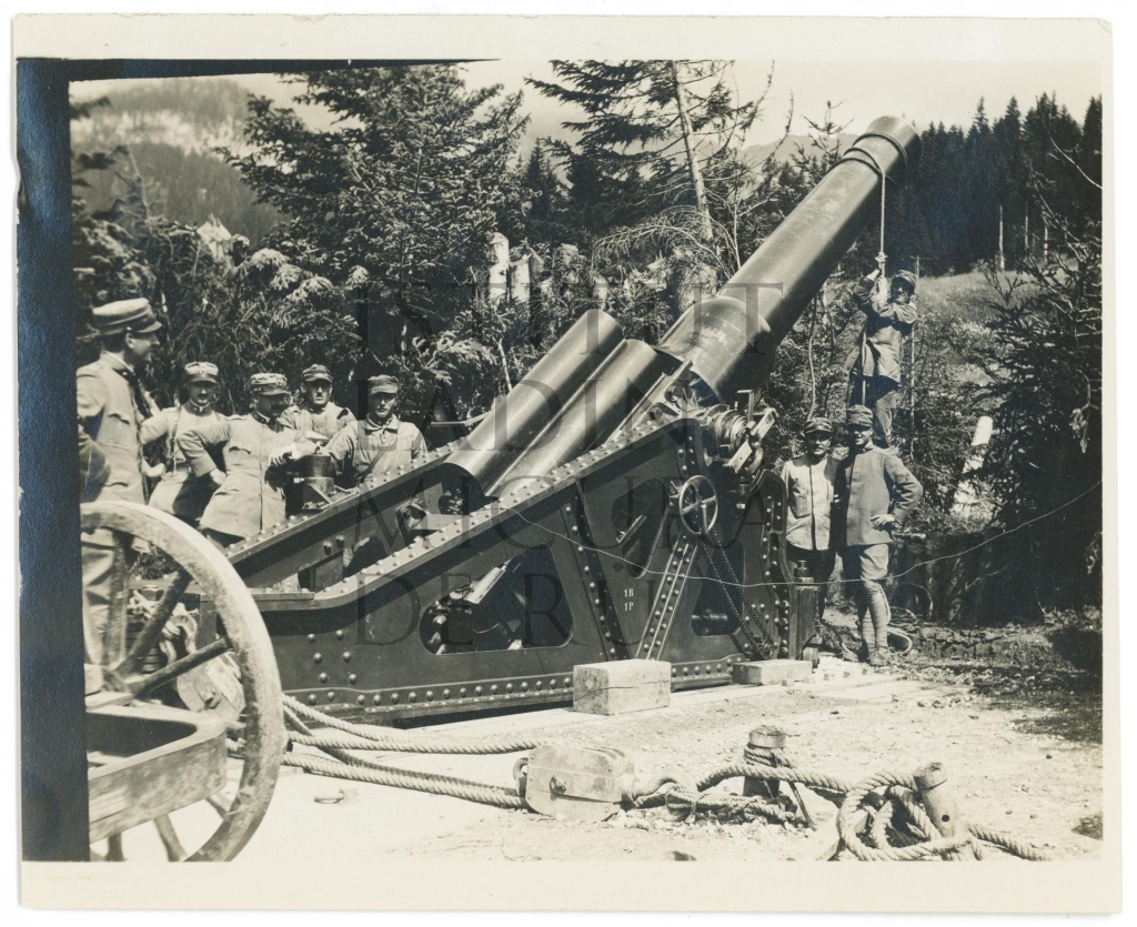 Descriziun: Soldas stá sö por la fotografia dlungia n'aubiza (sort de canun) caliber 305.