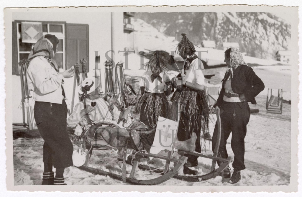 Descriziun: Le retrat mostra n grup de porsones zacan a Calfosch vistides sö por le Carlascé.
