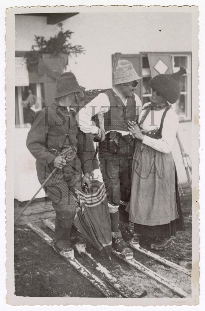 Descriziun: Le retrat mostra trëi ëi vistis sö por festejé Carlascé a Calfosch.