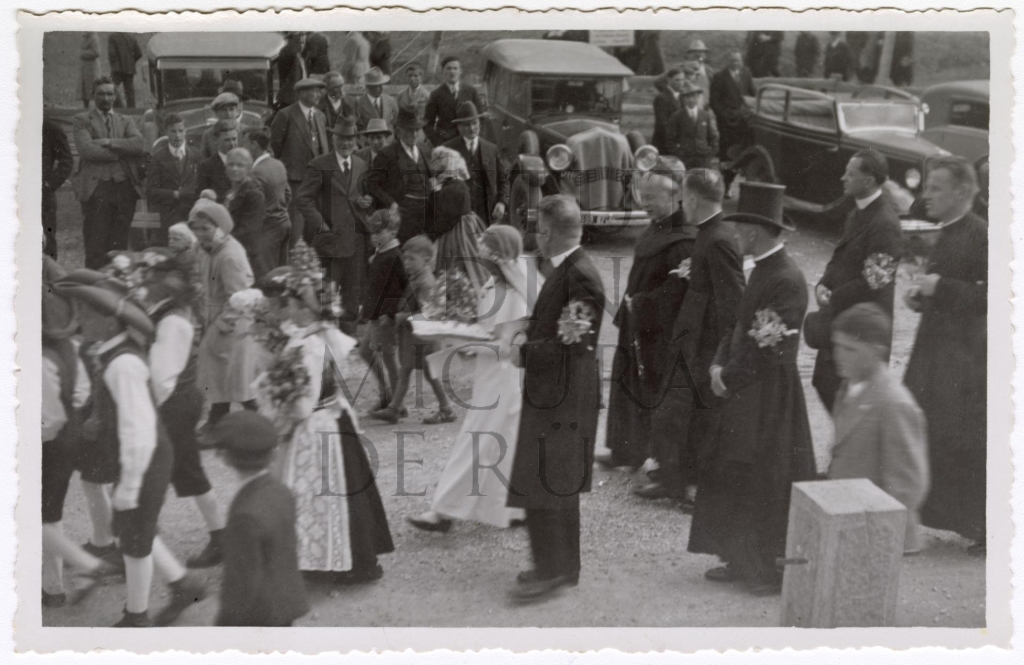 Descriziun: Le retrat é gnü tut sö tratan na prozesciun fata en gaujiun de na Mëssa Novela, bonamënter tla valada de Gherdëna (al é da odëi mituns y mitans cun la troht gherdëna).