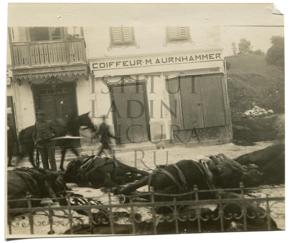 Descriziun: Fotografia de ciavai morc, copá da na bomba fora por le strades de n paisc, bonamënter Cortina. Sön la ciasa doía pon lí döes tofles de na botëga de n friser.