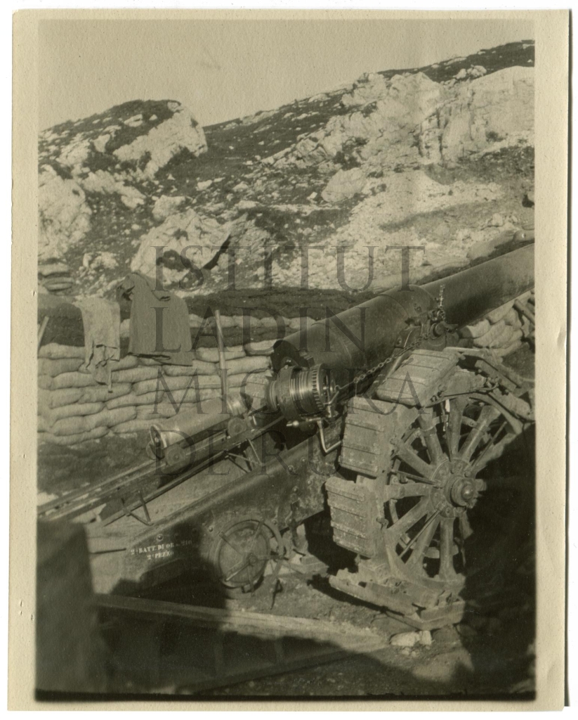Descriziun: Fotografia de n'aubiza (sort de canun) te n fossé de combatimënt fat sö cun sac de saurun dlungia les Cinch Tors (Pénes de Naerou por ampezan).