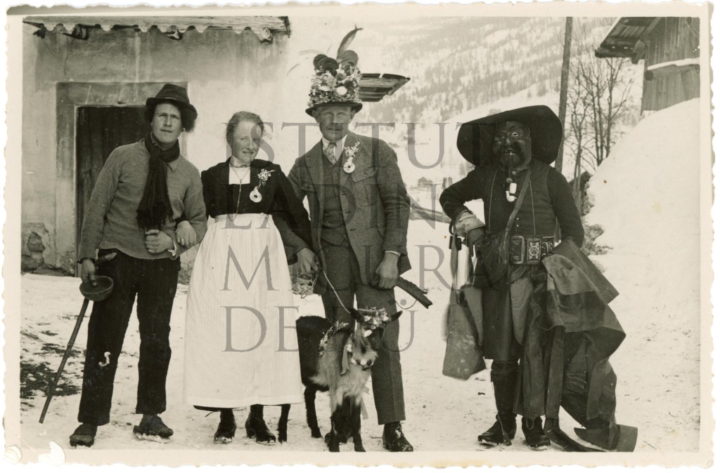 Descriziun: Candida Castlunger da Sompunt y Iarone Crazzolara da Cianins ciafa la cioura müla le de dla noza de Rosina y Sepl Crazzolara. La cioura müla é na cioura da degügn corgn, che gnô menada tl local dl past da noza da matleres mascherá; i fredesc y les sorus plü vedli di novic che ê ciamó da maridé messâ spo cumpré jö la cioura müla ai matleres, por che ai lascess dai coiené.
