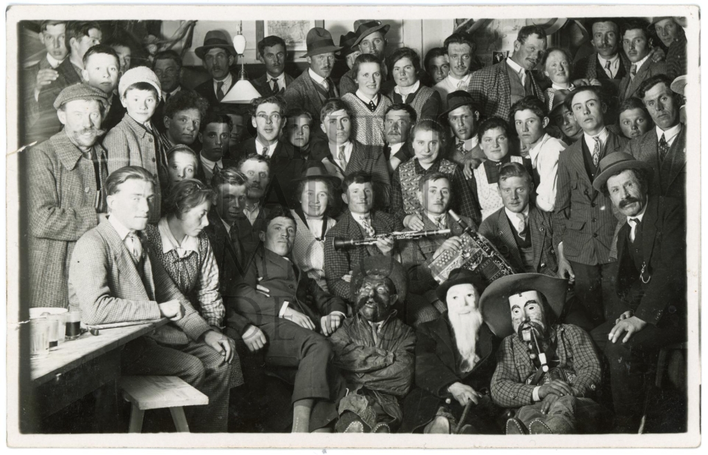 Descriziun: Le retrat é bonamënter gnü tut sö en Carlascé a Sompunt, canche i jogn se incuntâ por sté en compagnia, fá damat, cianté y balé. Al podess ci ester n grup de jogn che ê jüs a Sompunt a fá vila, mo ai ê bëgn zacotanc.