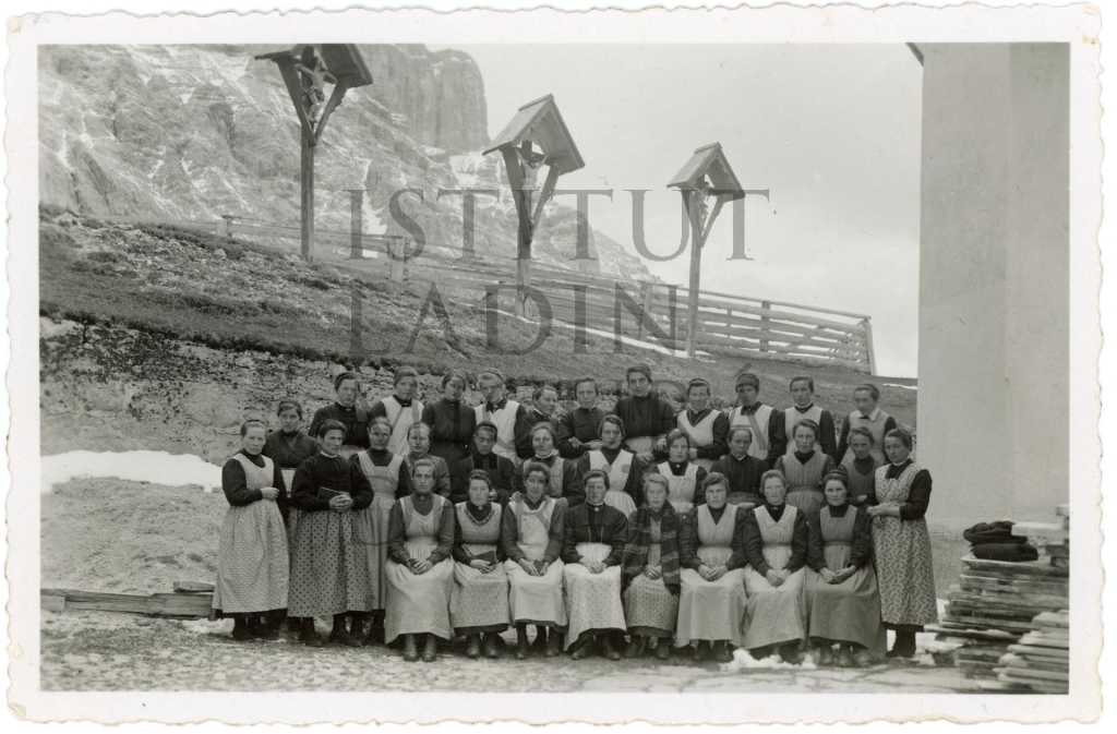 Descriziun: Le retrat mostra n grup d'ëres che â partezipé ai Eserzizi sö La Crusc d'aisciöda fora. I eserzizi ê na sort de meditaziun de grup basada sön i scric de San Nazio de Loyola; al ê momënc de reflesciun y oraziun.