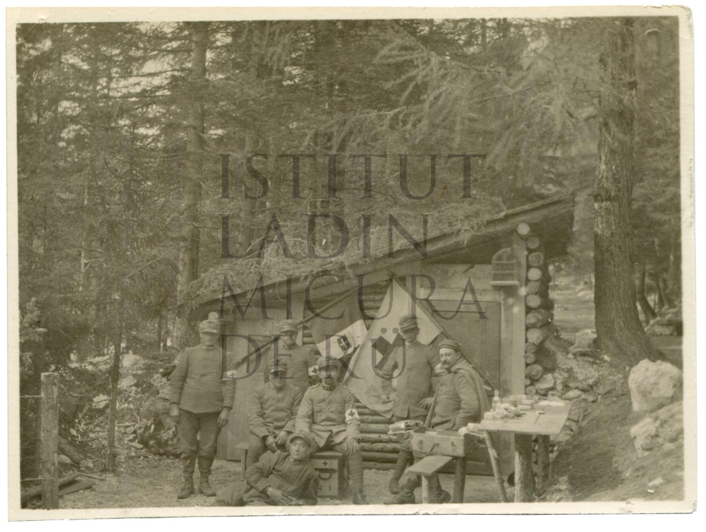 Descriziun: Grup de soldas, danter chisc deplö dotur militars, sentá dan dal ambulatore militar te Val Granda. Doía sön la baraca él taché sö la bandira dl Rëgn dla Talia y chëra dala crusc cöcena.