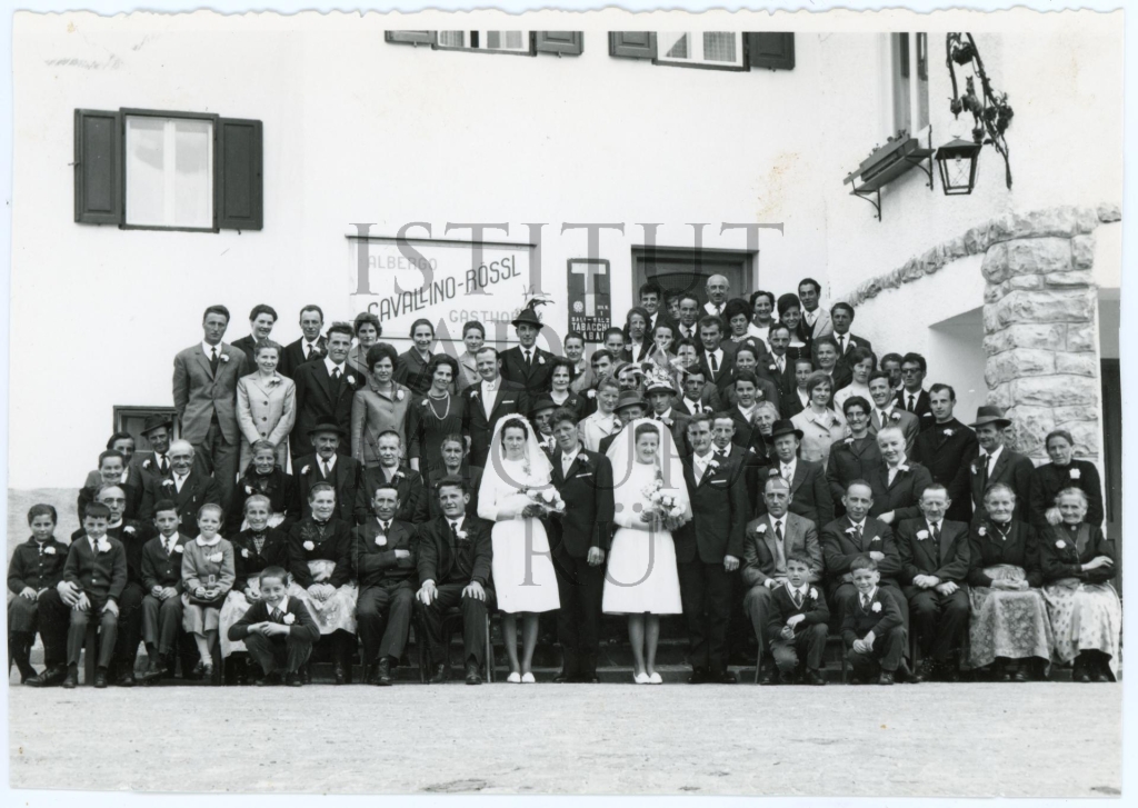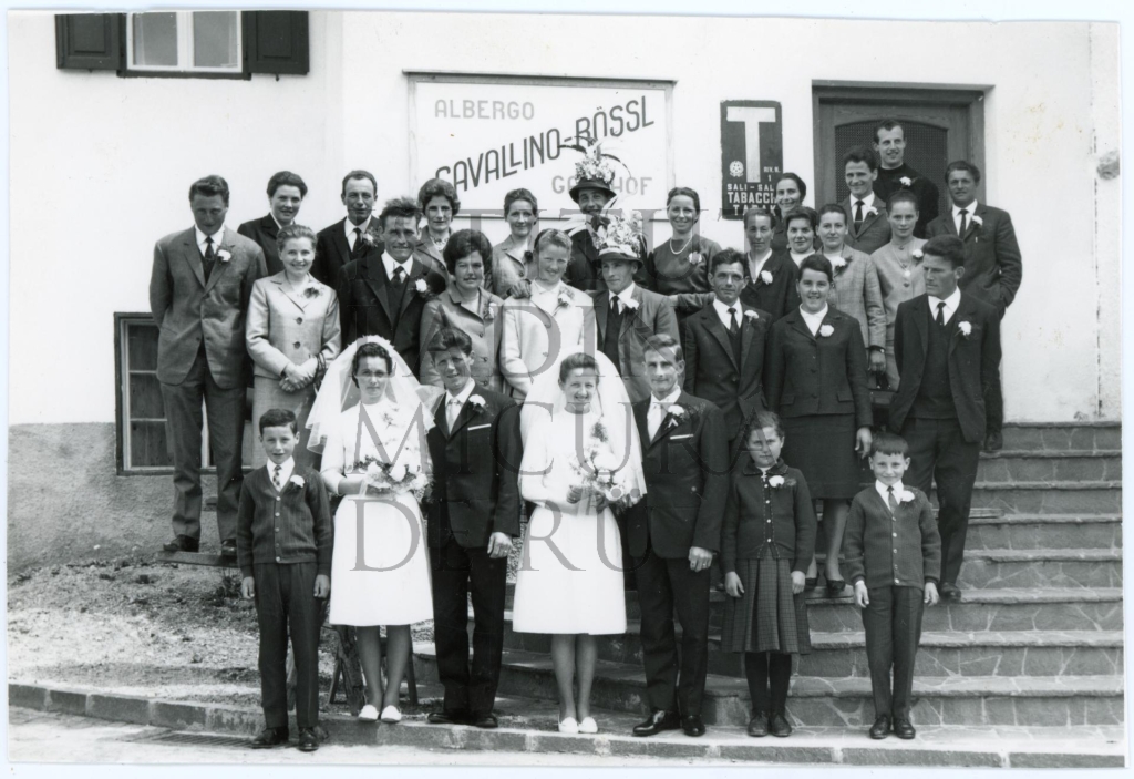 Descriziun: Fotografia de grup tuta sö dan le Cavallino-Rössl en gaujiun dla noza dopla di fredesc Pizzinini da Crafunara. I nüc sön la man ciampa é Rosina Declara y Sepl Pizzinini y chi sön la man dërta Carlina (Carolina) Pizzinini y Vijo Pitscheider.